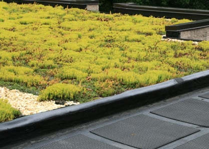 To prevent the spread of fire into, or from a building on to the green roof, a fire break of 300mm width is required around all perimeters and penetrations i.e. rooflights, soil pipes, rainwater outlets etc. The fire break should be increased to 500mm where there are openings to the building (such as doors, windows and opening roof lights etc). On large roofs, a one metre wide fire break should be installed at 40 metre intervals across the roof